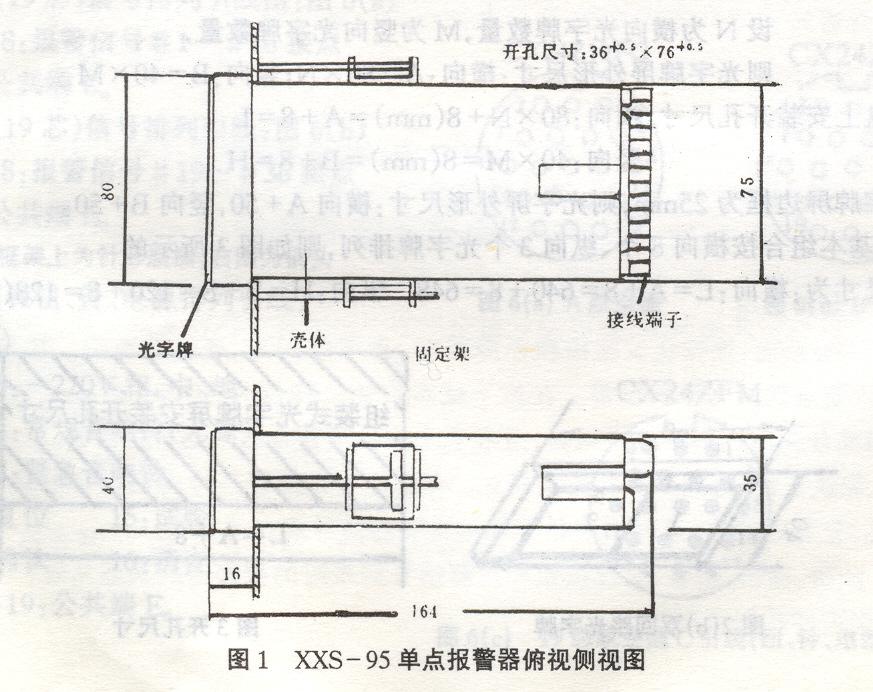 四、结构和安装 (一)结构: XXS-95 单点报警器结构 ( 见封面照片所示 ) 图 1 为单点报警器外形结构和外形尺寸。它包括光字牌、线路板、盒体、接线端子板。采用抽屈式结构 , 线路板和光字牌可以从盒体内拉出,便于维护、更换。 (二)安装方法: 1. 多个单点报警器组合的安装 多个单点报警器组合方式:⑴密集安装:以横向和纵向的个数按任意方式密集排列为几个屏的光字牌屏, 图2(a) 为典型 3 × 8 组合的密集安装。⑵分散安装