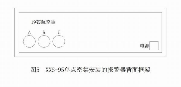 (一)密集安装:图5 为多个单点报警器密集安装的背面, 框架上安装有供用户接线的三个航空插A、B、C, 每个航空插为19芯引线。 A航空插对应报警信号#1~#18,B航空插对应报警信号#19~#36。每个19芯航空插引脚1~19对应报警及控制信号名,引线表如下: A,B是19芯航空插(信号引线用),C为19芯航空插(控制按钮引线用)