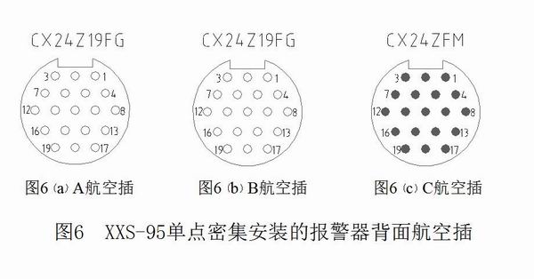 (1)A 航空插 (19芯 ) 信号排列引线:图6(a) 引脚 1~18: 报警信号 #1~#18 接点 引脚 19:公共端 E。 (2)B 航空插 (19 芯 ) 信号排列引线:图6(b) 引脚 1~18: 报警信号 #19~#36 接点 引脚 19:公共端 E 。 注:A、B 在框架上为针形插座。 (3)C 航空插 (按钮、铃、电源排列引线 )见图6(c) 引脚1~3:~220V 相、中、地; 引脚4~5:常规音响铃 ( 无源 ); 引脚6~7:紧急音响;引脚13:复位 引脚14:确认 引脚15:试验 引脚16:消音 引脚17~19: 公共端 E 。