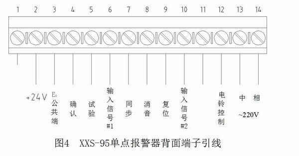 五、接线方法 图4 为一个 " 单点报警 器的背面 "14 线端子。其中 输入信号 #1 对应单个光字 牌 ( 称单回路 } 闪光 ; 若用输 入信号 #1 和 #2, 是对应双 光字牌 ( 分上下或左右 ) 见图 2(b) 闪光 , 称双回路 , 接线见图4