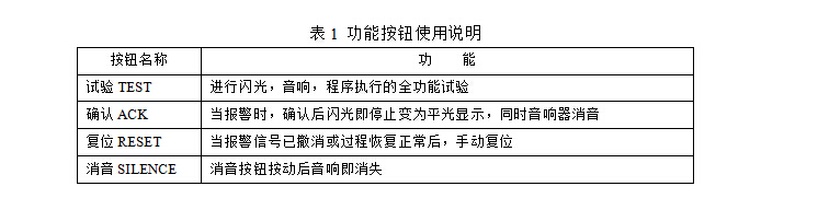 5.操作使用方法 5.1.开机和系统指示 当微机报警系统各部分安装连接完毕后,便可将机柜下方的总开关合上开机通电,通电后电源单元上电压表指示正常,监控单元面板上的15个电源分配总线故障指示灯均不亮,每个报警单元面板上第一个“闪光报警指示”应该闪光,这样表示整个系统内工作基本正常。 5.2.自检测试 报警系统可由监控单元面板上的试验按钮或盘上的试验按钮对160点报警通道进行自检测试,按下试验按钮时光字牌应闪光、音响报警,表示160点自检测试全部正常,可以投入使用。 5.3.报警控制按钮的操作 盘上的各组报警控制按钮中的“试验”“复位”、“确认”、“消音”电气上均是并接使用。 现场来的任何一个报警信号都能使对应的光字牌闪光且铃响。首出点快闪,后续点慢闪。当按动“确认”按钮后则闪光变为平光,同时音响消除,若接着又有新的报警信号则该点对应的光字牌闪光,且响铃。而已确认过的报警点继续保持平光,报警点撤消,对应光字牌熄灭。见表2。
