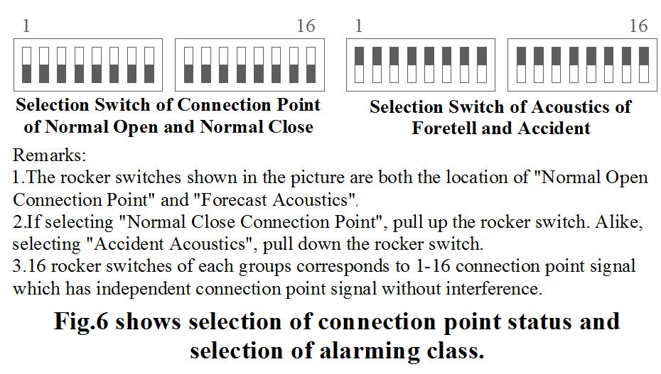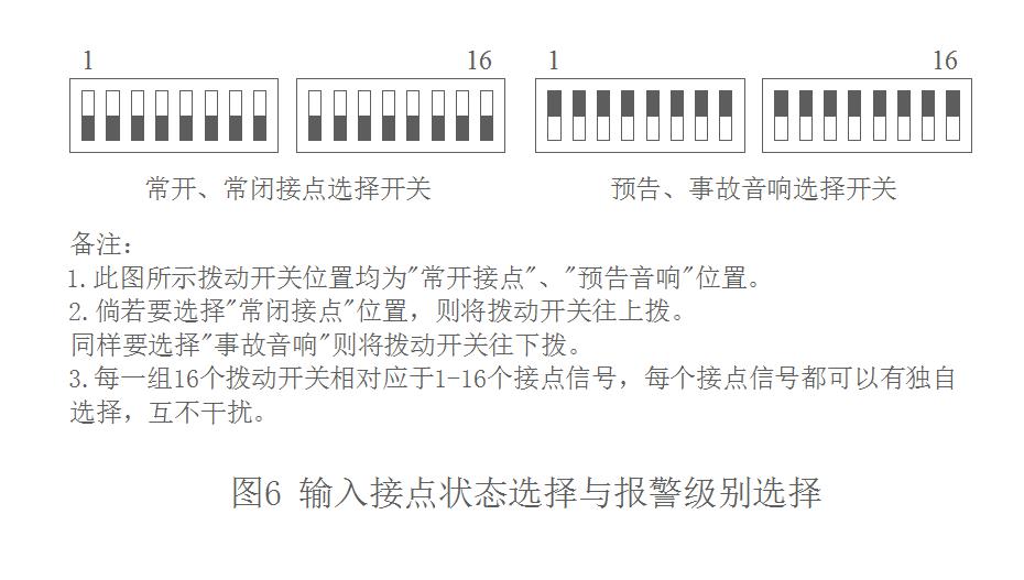 5.4.微机报警插件板 每一块报警插件板均为独立对16个报警点进行报警的控制单元,每块插件板的正面有四个指示灯,最上面的指示灯为同步闪光指示,其他三个灯亮分别表示微处理器、信号公共接点(AP)电压和光字牌公共电压正常。每块微机报警插件板可以在机内互换替代。 5.5.常闭、常开触点的混合选择 每块微机报警插件板的16个报警点,可以根据发电机组的常开、常闭接点进行混合选择。选择方法只要将报警插件板上的16个微型拨动开关按常闭、常开方向拨动即可。同样可选择“预告音响”与“事故音响”,见图6。