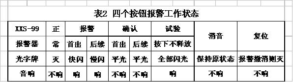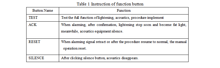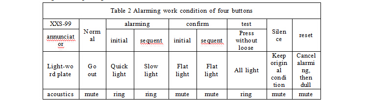 5.1. Start-up and System IndicationAfter the completion of the installation and connection of each part of micro computer alarming system, the general switch below the cabinet closes to start-up and electrify. After electrified, the voltage table in power unit indicates normal. The failure indicator of 15 power distribution in supervision unit panel is dull. The first “Light Alarming Indication” in each alarming unit panel shall light which shows the normal work of the whole system. 5.2. Self-test Alarming system can self-test 160 alarming channel by the test button in supervision unit panel and the test button in panel. When pressing test button, light-word plate shall lightening and acoustics alarms showing that 160 self-test are normal and can be exerted to use. 5.3. Operation of Alarming Control Button Then button of alarming control of each group in plate of “test”, “reset”, “confirm” and “silence” are combined to use. Any on-site alarming signal can make corresponding light-word plate lighten and ring. The initial point lightens quickly and sequent point lightens slowly. When pressing the button of “confirm”, the light becomes flat light and meanwhile acoustics is silent. If there is new alarming signal, the corresponding light-word plate lightens and rings. The confirmed alarming point continues to keep flat light and alarming point retracts as well as corresponding light-word plate goes out. See table 2.