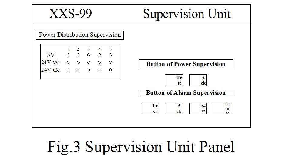 XXS-99 computer alarming system is cabinet structure. The dimension of cabinet is 2.1 meters in height, 0.70 meters in width and 0.60 meters in depth (special dimension can be instructed when ordered and can be customized). The location of each part in the interior of cabinet can be seen in fig.1, fig2, among which fig.1 is cabinet front view and fig.2 is cabinet back view. ![]() 3.1. Terminal Socket Alarming Signal Terminal socket alarming signal is shown as fig.2 which is in the two side of right and left in the back of cabinet. The right is A1~A5 (80) signal input terminal. The left is A6~A10 (80) signal input terminal. It access alarming parts board of computer alarm unit with dynamotor group’s alarming contact via cable. (see appendix 1 and appendix 2 for connector terminal arrangement and connector instruction). 3.2. Parts Board of computer alarming In the alarming unit of fig.1, 10blocks of alarming parts board can be inserted. There are 10 alarming points in each alarming parts board. Alarming contact can be normal open contact and normal close contact. Each board has the same structure and interactively substituted to use. Each alarming parts board has four light emitting diode indicator light which is job instruction. When it is in operation, the first LED light emitting diode in the upper end is normal lightening in normal work. When it is fat light or dull, it means that the alarming board has failure. At that time, pull out failure board (can plug-in with power) and change with new board. 3.3. Supervision Unit Supervision unit is the supervision and control core of the whole alarming system. Fig.3 is panel view of supervision unit. Its left is “power distribution supervision”, among which there are 15 light indicator light respective showing the work condition of the power of 5 lines 3 groups (5V,24V(A),24V(B). lightening means failure happening in the power in the group. Its right is control button.