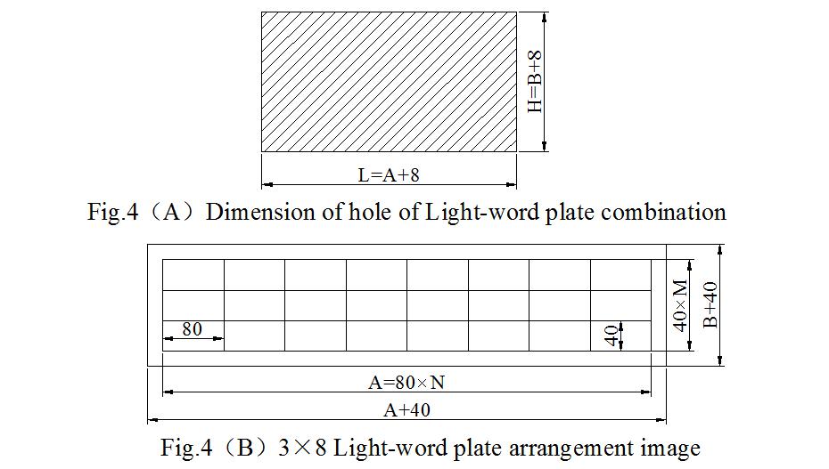 3.4.光字牌组: XXS-99型微机报警系统的光字牌是分组安装在盘上,每组以任意矩阵方式排列,例如6×6=36个、6×4=24个、8×3=24个等排列供选择,各自的开孔尺寸见图4所示,也可以根据现场要求另外排列。盘上每组光字牌通过配有N个19芯航空插头的电缆线接至报警单元的背面,与报警插件相接。