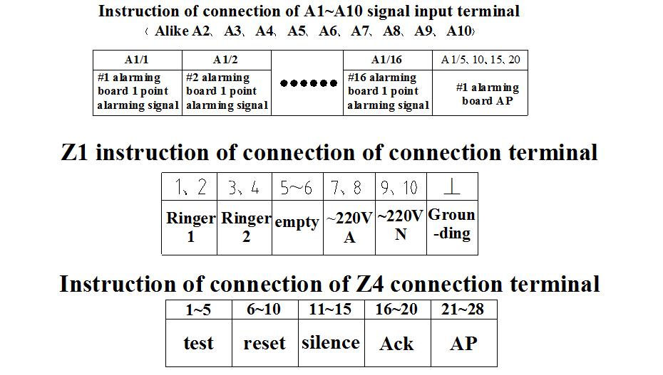 2.1. Input Signal:2.1.1. The contact of normal close and normal open can be mixed selected a twill by rocker dual in-line package switch in the component board of alarming unit to select. 2.1.2. Have optoelectronic separation equipment 2.1.3. Have selection switch of signal unblock 2.1.4. Can be re-transmitted(return). 2.2. Alarming points: 160 points. 2.3. On-site contact voltage:+24V(DC)、current:7mA(offered by alarming system). 2.4. Button of operation control: four buttons of “test”, “confirm”, “silence”, “reset” is a group which can be grouped to contact to operation console. 2.5. Indication equipment: LED illuminant light-word plate. Alarming signal firstly quickly glitters and later slowly glitters. Initial alarming signal quickly lightens and sequent one slowly lightens. 2.5.1.Light-word plate: dimension of each light-word plate: three kinds of 48mm×96mm、32mm×72mm、40mm×80mm. The light-word plate has color of red, green, yellow and so on which can be selected according to different supervision by users. 2.5.2. Combination mode of light-word plate: random combination, see fig.4. 2.5.3.Acoustics Equipment: ringing or buzzer. Normal acoustics and emergency acoustics. 2.6. Stable voltage power: Microprocessor uses+5V/20A switch power, signal contact uses +24V/4.2A, light-word plate uses +24V/20A and supervision unit uses multiple switch power. 2.7. External dimension of cabinet: 2.1 meters in height, 0.70 meters in width, 0.60 meters in depth (special dimension can be customized.) 2.8. Terminal socket and cable: 2.8.1. Input signal terminal socket 10 blocks and each block has 16 signal contacts. 2.8.2. Signal input cable enters cabinet via ground groove by dynamotor group. Light-word plate connects output cable (19 chips) which can induct to cabinet from the bottom of cabinet. The length of cable is decided by users. 2.9. Integrated consumption: not more than 150 watt in normal application and less than 760 watt in test. 2.10.Enviroment temperature: 0℃~60℃.